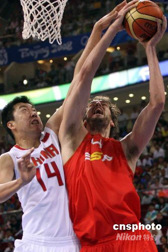 北京奧運會男子籃球小組賽第二輪賽事8月12日打響,首戰(zhàn)負于“夢八隊”的中國男籃在姚明率領(lǐng)下向世錦賽冠軍西班牙隊發(fā)起猛攻,上半場結(jié)束,中國以46比37領(lǐng)先。圖為王郅治封蓋加索爾的扣籃。中新社發(fā) 任晨鳴 攝