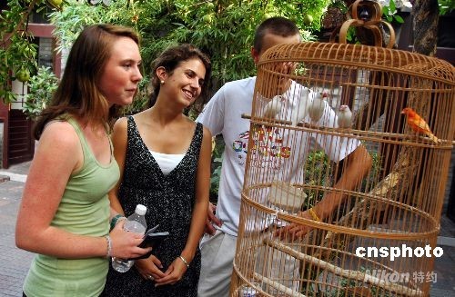 8月12日,首批美國學生來京觀看奧運會并入住“奧運人家”。他們是將要上大學的美國學生,克瑞斯表示很喜歡老北京的四合院,將在這里住3天。據悉,北京在奧運會期間共開設598戶“奧運人家”,可提供726間客房,能一次接待1000多名中外觀眾和游客。圖為他們很高興的欣賞四合院中的小鳥。中新社發(fā) 張雙雙 攝