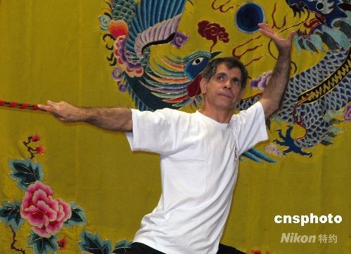 英國四十七歲的男子格法(圖)十二日在北京湖廣會館大戲樓秀了一出猴戲。 這名學京劇已經(jīng)十五年的英國人,生在英格蘭、長在不列顛、安居在美國,卻對中國京劇著了迷。格法的主要角色是演猴子。圖為格法給北京奧運會期間的中外非注冊記者表演他演了多年的猴戲。中新社發(fā) 徐長安 攝