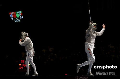 8月12日晚,08北京奧運(yùn)會(huì)男子佩劍個(gè)人賽決賽在北京國(guó)際會(huì)議中心擊劍館揭開(kāi)戰(zhàn)幕,賽會(huì)黑馬14號(hào)種子中國(guó)選手仲滿和法國(guó)選手洛佩茲在決賽中遭遇,結(jié)果中國(guó)選手仲滿以15-9戰(zhàn)勝對(duì)手獲得冠軍,這是中國(guó)男子擊劍在奧運(yùn)會(huì)上第一次獲得冠軍。 中新社發(fā) 盛佳鵬 攝