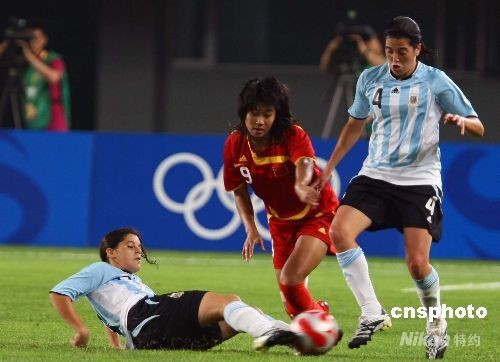8月12日晚,奧運(yùn)女足小組賽第三輪賽事展開,中國(guó)女足對(duì)陣阿根廷隊(duì)。第50分鐘,中國(guó)隊(duì)右路起球,阿根廷門將出擊失誤沒摘到球,韓端與對(duì)方防守球員碰撞中把球打進(jìn)了球門。中新社發(fā) 劉新 攝