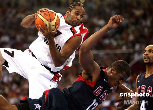 北京奧運會男子籃球小組賽第二輪賽事8月12日開始,美國“夢八隊”以97比76擊敗非洲冠軍安哥拉隊,取得小組賽兩連勝。非洲冠軍安哥拉隊雖然告負(fù),但是其頑強的斗志與球技博得廣泛好評。中新社發(fā) 任晨鳴 攝