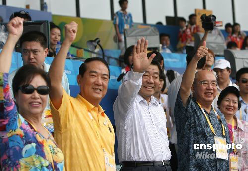 8月13日,北京奧運(yùn)會棒球比賽揭幕戰(zhàn)在中華臺北隊(duì)和荷蘭隊(duì)之間舉行,中共中央政治局常委、全國政協(xié)主席賈慶林與中國國民黨主席吳伯雄、親民黨主席宋楚瑜到現(xiàn)場觀戰(zhàn),共同為中華臺北棒球隊(duì)加油。中新社發(fā) 武仲林 攝