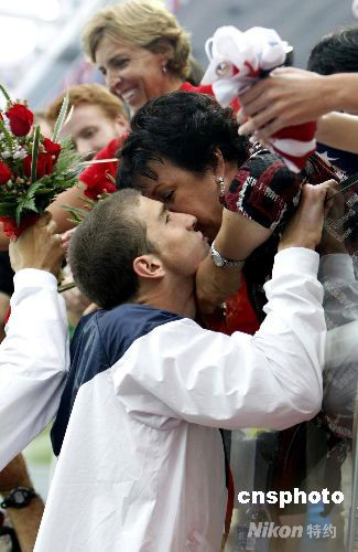 8月13日,美國游泳傳奇人物菲爾普斯,在北京奧運會男子4乘200米自由泳接力中奪得自己奧運會的第11枚金牌后,擁抱并親吻在“水立方”看臺上觀戰(zhàn)的媽媽黛比(Debbie)。 中新社發(fā) 杜洋 攝