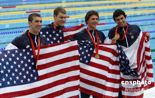 8月13日,美國游泳隊在“水立方”舉行的北京奧運會男子4x200米自由泳接力比賽中,以6分58秒56的成績打破他們保持的7分03秒24的世界紀(jì)錄,并奪得金牌。中新社發(fā) 杜洋 攝