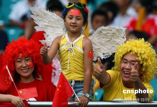 8月13日傍晚,北京奧運(yùn)會男子足球預(yù)賽,中國對巴西的比賽即將在秦皇島奧體中心舉行,觀眾席一位“小天使”球迷在家長的陪同下前來助陣。 中新社發(fā) 劉新 攝