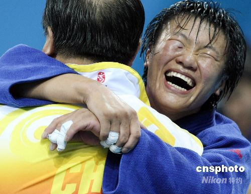 楊秀麗獲得金牌后,與中國(guó)柔道隊(duì)總教練劉永福熱情擁抱。