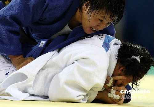 楊秀麗獲得金牌后,與中國(guó)柔道隊(duì)總教練劉永福向熱情的觀眾展示國(guó)旗。
