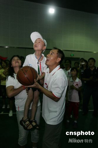 8月14日下午,李寧、楊揚(yáng)和潘曉婷與艾滋孤兒玩起了羽毛球、乒乓球等體育游戲。“快樂奧運(yùn)會”由李寧基金會發(fā)起,與阜陽市艾滋病貧困兒童救助協(xié)會聯(lián)手,邀請阜陽的30名艾滋孤兒來到北京,觀看了奧運(yùn)會的射擊比賽,并游覽北京名勝古跡。圖為李寧(右)在教艾滋孤兒打籃球。中新社發(fā) 沈晨 攝