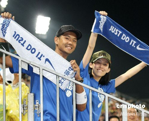 8月14日晚,在北京五棵松棒球場(chǎng)進(jìn)行的中華臺(tái)北對(duì)日本之戰(zhàn)吸引了眾多臺(tái)灣球迷的目光。臺(tái)灣當(dāng)紅藝人陳建州(左)和范瑋琪(右)專程到場(chǎng)為中華臺(tái)北隊(duì)加油。 中新社發(fā) CNAsports 攝