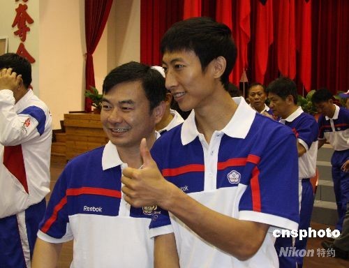 出征第二十九屆奧運(yùn)會的中華臺北隊(duì)七月三十日在高雄左營運(yùn)動選手訓(xùn)練中心正式成軍。圖為跆拳道選手朱木炎與教練蔡明志在儀式舉行后合影。 中新社發(fā) 曾嘉 攝