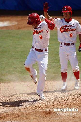 8月15日,北京奧運(yùn)會(huì)棒球男子預(yù)賽在北京五棵松棒球場舉行,中國隊(duì)對陣中華臺(tái)北隊(duì)。最終中國隊(duì)經(jīng)過四個(gè)多小時(shí)的苦戰(zhàn),以8:7逆轉(zhuǎn)戰(zhàn)勝中華臺(tái)北隊(duì)。圖為中國隊(duì)9號(hào)張玉峰(左)慶祝得分。中新社發(fā) 盛佳鵬 攝