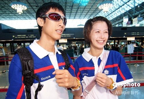 8月15日,中華臺(tái)北跆拳道選手朱木炎(左)、楊淑君飛赴北京參加奧運(yùn)比賽,兩人在機(jī)場(chǎng)都秀出日前求來(lái)的佛珠,希望一路平安、比賽順利。中新社發(fā) CNAsports 攝