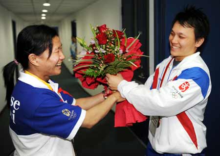 中華臺北代表隊舉重女將盧映锜(右)12日在女子63公斤級,以抓舉104公斤、挺舉127公斤,總合231公斤的成績贏得銅牌,另一面銅牌得主隊友陳葦綾(左)獻(xiàn)上鮮花祝賀。(上圖)