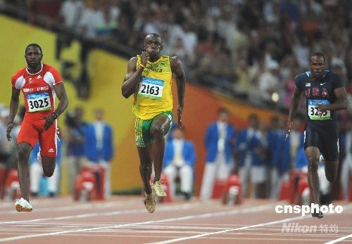 8月16日晚,牙買加選手尤塞恩·博爾特在中國國家體育場“鳥巢”進(jìn)行的北京2008年第二十九屆奧運(yùn)會(huì)男子100米決賽中,以9秒69的成績奪得金牌并打破9秒72的世界紀(jì)錄。中新社發(fā) 古玉 攝