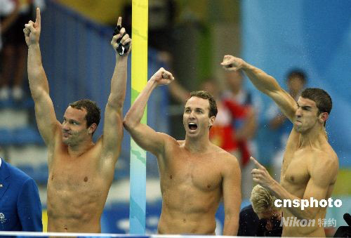 8月17日,美國隊(duì)獲得北京奧運(yùn)會男子4乘100米混合泳接力冠軍,至此,23歲的美國游泳運(yùn)動員菲爾普斯不僅用8金刷新了單屆奧運(yùn)會金牌紀(jì)錄,而且還將個人所有奧運(yùn)會的金牌總數(shù)提高到了14枚,達(dá)成了他人難以超越的“世界紀(jì)錄”。 中新社發(fā) 杜洋 攝
