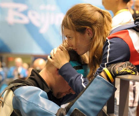 奧運男子50米步槍三姿決賽中美國選手埃蒙斯最后一槍失手痛失金牌,妻子卡特琳娜安慰失落的丈夫。