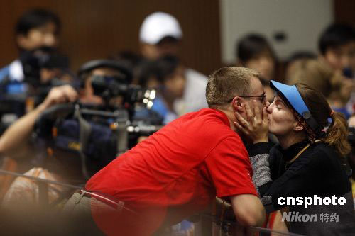 失落的埃蒙斯走到妻子的面前,這位射落本屆奧運會首金的捷克女神槍手,捧起丈夫的臉,輕輕地摩挲,用深情的注視和呢喃來安慰他……,就像卡特琳娜奪金之后與丈夫深情一吻一樣,這一刻也給觀眾留下了深刻而溫馨的印象。