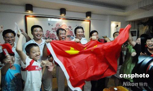 8月17日晚,“超級(jí)丹”林丹獲得北京奧運(yùn)羽毛球男單金牌,林丹的父親林建斌和數(shù)十名親友在福建省龍巖市上杭縣家中為其舉旗慶賀。中新社發(fā) 林福達(dá) 攝