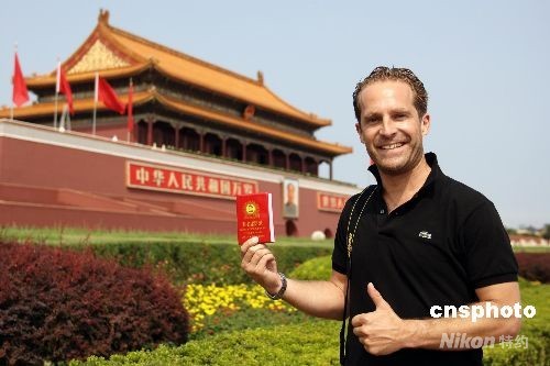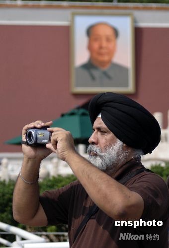 8月18日,一位前來北京觀看奧運會的外國游客手持毛主席語錄在天安門前留影。中新社發(fā) 王東明 攝