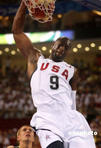 8月18日,北京奧運會男籃小組賽最后一輪賽事在北京五棵松籃球館舉行,此前四戰(zhàn)四勝的美國“夢八隊”以106比57橫掃由NBA巨星德克·諾維茨基率領的德國隊,隊中各員大將輪流上演扣籃絕技。美國隊的勝利確保了中國隊進入前八席位。圖為韋德在扣籃。 中新社發(fā) 任晨鳴 攝