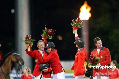 八月十八日晚,美國(guó)隊(duì)獲得奧運(yùn)馬術(shù)場(chǎng)地障礙賽團(tuán)體金牌,笑逐顏開登上領(lǐng)獎(jiǎng)臺(tái)。當(dāng)日,奧運(yùn)馬術(shù)比賽在香港沙田進(jìn)行場(chǎng)地障礙賽團(tuán)體決賽,決出奧馬第四塊金牌。中新社發(fā) 洪少葵 攝