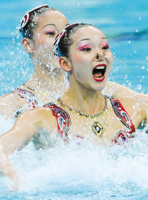 18日下午,北京奧運(yùn)會花樣游泳比賽在“水立方”迎來第一個(gè)比賽日。第一輪雙人技術(shù)自選動作的比賽結(jié)束后,俄羅斯隊(duì)的奧運(yùn)會和世錦賽雙料冠軍達(dá)維多娃/葉爾馬科娃憑借絕對的優(yōu)勢,以49.334分排在第一位,中國選手蔣文文/蔣婷婷以48.084分排在第四位。