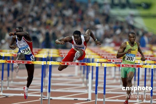 8月20日晚,在國家體育場鳥巢進行的北京奧運會男子110米欄半決賽中,世界紀錄保持者古巴選手羅伯斯(中)在第一小組比賽中以13秒12獲得第一,順利晉級決賽。中國選手史冬鵬僅跑出13秒42,位列小組第五,無緣決賽。中新社發(fā) 盛佳鵬 攝