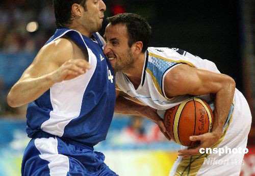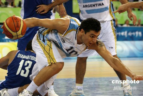 北京奧運會男籃最后一場八進四比賽,8月20日午夜時分在五棵松籃球館舉行,南美洲冠軍、雅典奧運會冠軍阿根廷隊以80比78驚險戰(zhàn)勝歐洲勁旅希臘隊,進入前四名。阿根廷隊將與美國“夢八隊”爭奪決賽權。隊中“老大”、在NBA馬刺隊效力的球星吉諾比利不僅砍下全場最高的24分,而且在最后時刻投中關鍵一球;另一名球星10號德爾菲諾(DELFINO Carios Francisco)砍下23分。中新社發(fā) 任晨鳴 攝