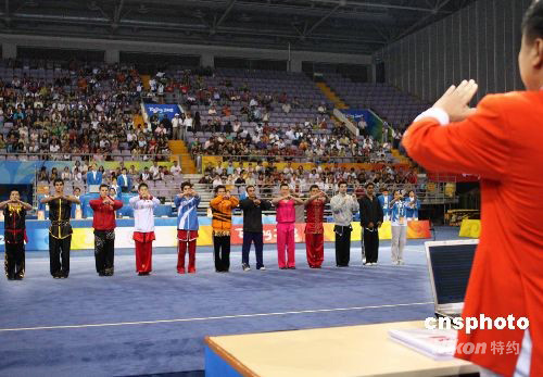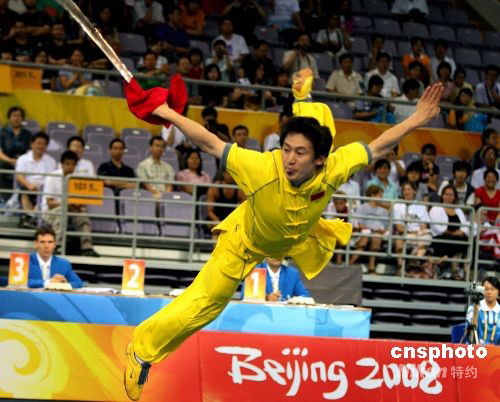 8月21日,“北京2008武術(shù)比賽”在北京奧林匹克體育中心體育館拉開帷幕。“北京2008武術(shù)比賽”經(jīng)國際奧委會(huì)批準(zhǔn),由北京奧組委、國際武術(shù)聯(lián)合會(huì)主辦,中國武術(shù)協(xié)會(huì)承辦,于8月21日至24日在北京舉行。比賽設(shè)套路10枚金牌、散手5枚金牌。有來自世界五大洲43個(gè)國家和地區(qū)的128名男女運(yùn)動(dòng)員參加比賽。為了使更多國家和地區(qū)的運(yùn)動(dòng)員在本次比賽中獲得獎(jiǎng)牌,國際武術(shù)聯(lián)合會(huì)做出了在15個(gè)比賽項(xiàng)目中,每個(gè)國家和地區(qū)最多只能參加8項(xiàng)的規(guī)定。中新社發(fā) 宋吉河 攝