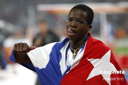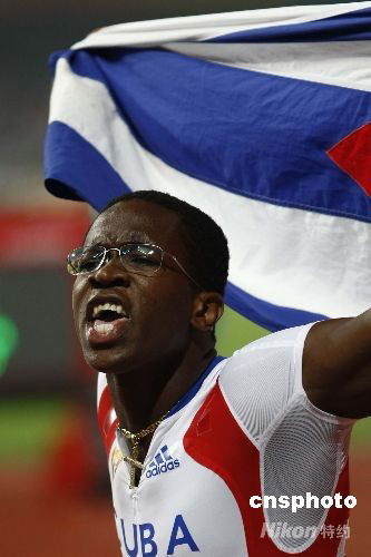 羅伯斯慶祝北京奧運(yùn)男子110米欄奪冠。 中新社發(fā) 盛佳鵬 攝