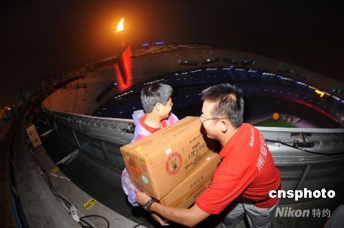 北京奧運會閉幕式上的焰火表演將再次為世人奉獻一場華美的視覺盛宴。截止到八月二十二日下午,“鳥巢”煙花燃放已準備就緒,屆時將為世人展現(xiàn)有別于開幕式的令風姿。圖為負責煙火燃放的人員在鳥巢頂上安裝焰火。中新社發(fā) 鐘新 攝