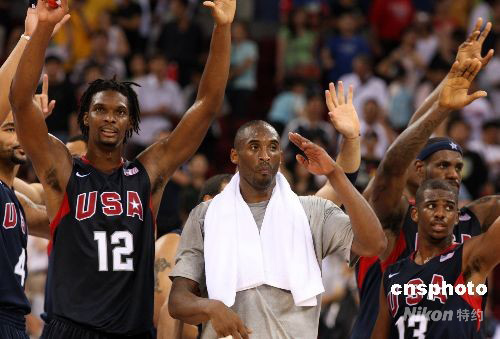8月22日晚,北京奧運會男子籃球半決賽第二場比賽在五棵松籃球館開戰(zhàn),美國“夢八隊”最后以101比81戰(zhàn)勝上屆奧運會冠軍阿根廷隊,進入決賽。賽后,科比率領美國眾球星向觀眾敬禮致謝。中新社發(fā) 任晨鳴 攝