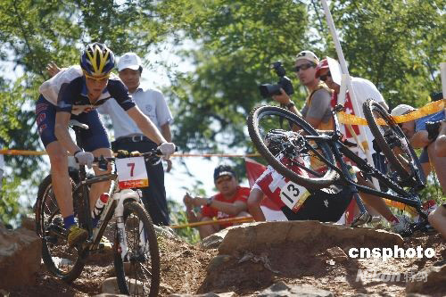 8月23日,北京奧運會自行車山地分項女子越野賽在北京老山山地自行車場舉行,不少參賽選手在陡峭的賽道上翻車。中新社發(fā) 盛佳鵬 攝