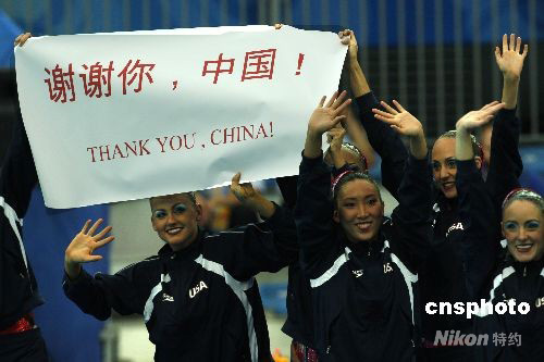 8月23日,美國花樣游泳隊入場時打出“謝謝你,中國”的標(biāo)語。 中新社發(fā) 杜洋 攝