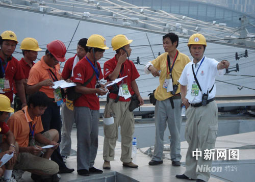 圖為工作人員在“鳥(niǎo)巢”進(jìn)行閉幕式煙火最后的安裝調(diào)試。 攝影:欣悅