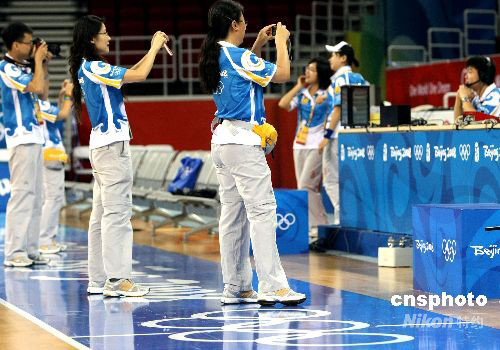 8月24日,北京奧運(yùn)會閉幕日,在北京五棵松籃球館服務(wù)了1個多月的大學(xué)生志愿者們,清晨到籃球場內(nèi)拍攝珍貴的留念照。北京奧運(yùn)會的賽會志愿者大多數(shù)是北京地區(qū)的在校大學(xué)生,他們的整體服務(wù)受到與會者的高度評價。中新社發(fā) 任晨鳴 攝