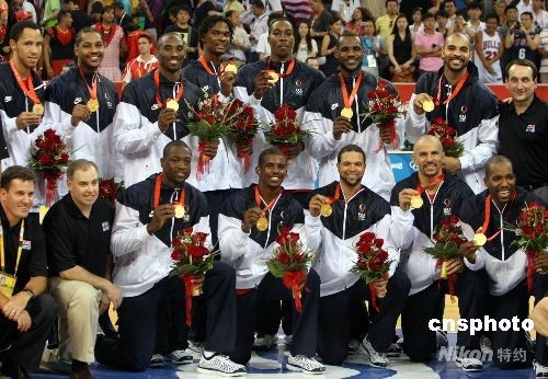 8月24日下午,北京奧運會男籃決賽在五棵松籃球館舉行,美國“夢八隊”以118比107艱難戰(zhàn)勝2006年世錦賽冠軍西班牙隊,獲得本屆奧運會金牌;10號科比獲得21分,9號韋德獲得22分。已經(jīng)連續(xù)在世錦賽、奧運會丟失冠軍寶座的美國隊,終于依靠超強的實力與瘋狂的進(jìn)攻與防守打敗所有對手,令人心服口服地獲得冠軍,科比、詹姆斯、基德、韋德、安東尼、霍華德等NBA超級球星終于圓了奧運金牌夢。中新社發(fā) 任晨鳴 攝