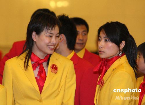 8月26日,2008年北京奧運(yùn)會(huì)中國(guó)體育代表團(tuán)總結(jié)大會(huì)在北京人民大會(huì)堂金色大廳舉行。郭晶晶、吳敏霞出席北京奧運(yùn)會(huì)中國(guó)體育代表團(tuán)總結(jié)大會(huì)。中新社發(fā) 廖文靜 攝