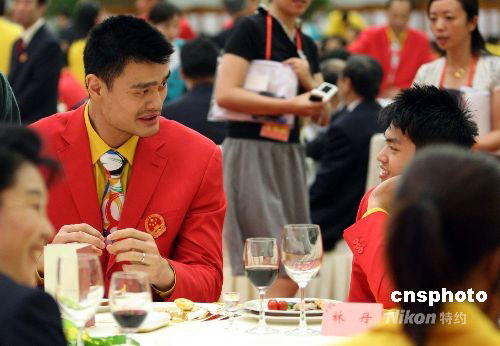 姚明、林丹參加北京奧運(yùn)中國體育代表團(tuán)慶祝宴會(huì)。中新社發(fā) 廖文靜 攝