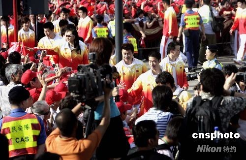 八月三十日上午八時,北京奧運會內(nèi)地金牌運動員代表團(tuán)到香港金紫荊廣場觀看升旗禮,圖為運動員與大批香港市民見面。中新社發(fā) 張勤 攝