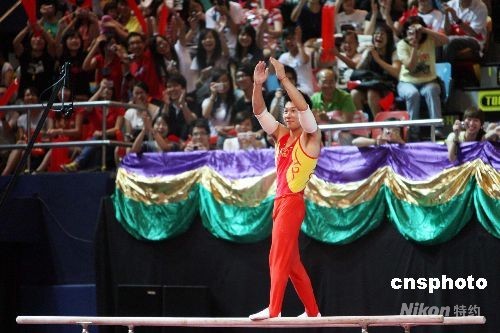 奧運(yùn)男子雙杠金牌選手李小鵬精彩表演后,站在雙杠上和觀眾招手致意。中新社發(fā) 洪少葵 攝