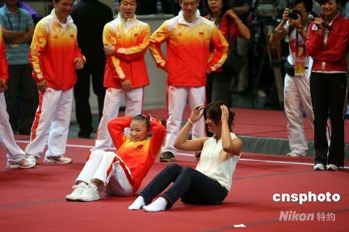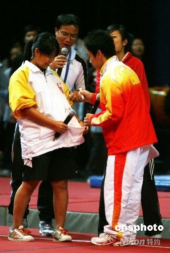 北京奧運(yùn)會(huì)內(nèi)地金牌運(yùn)動(dòng)員代表團(tuán)在香港伊麗莎白體育館作示范表演,并與青少年同樂。中新社發(fā) 洪少葵 攝