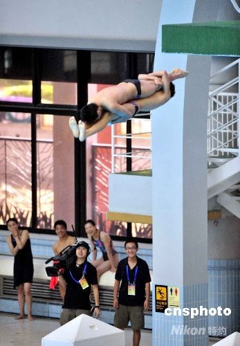 跳水運動員在荃灣城門谷游泳池作跳水示范表演。香港特區(qū)行政長官曾蔭權(quán)同太太亦到場觀賞跳水表演。中新社發(fā) 譚達(dá)明 攝