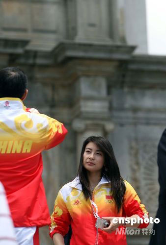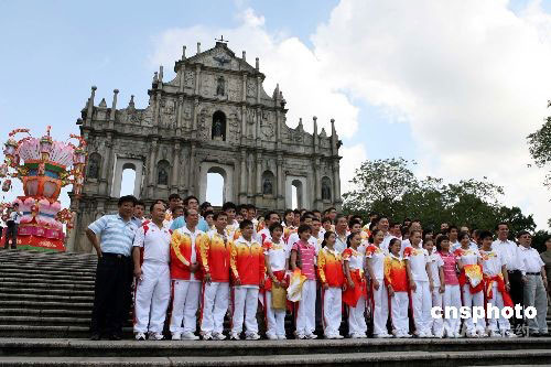 九月一日上午,在澳門訪問(wèn)的北京奧運(yùn)內(nèi)地金牌運(yùn)動(dòng)員代表團(tuán)一行來(lái)到著名景點(diǎn)大三巴游覽,興高采烈地合影。