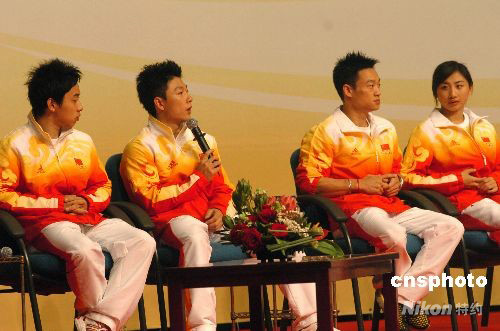 訪問(wèn)澳門的奧運(yùn)金牌運(yùn)動(dòng)員代表九月一日上午與澳門青少年真情對(duì)話。圖為體操運(yùn)動(dòng)員李小鵬與澳門學(xué)生交流。中新社發(fā) 畢永光 攝