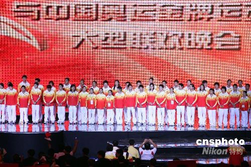 九月一日晚,北京奧運會金牌運動員代表團出席在澳門東亞運動會體育館舉行的大型聯(lián)歡晚會,與澳門市民分享他們在奧運會上拼搏奪金的精神。中新社發(fā) 洪少葵 攝