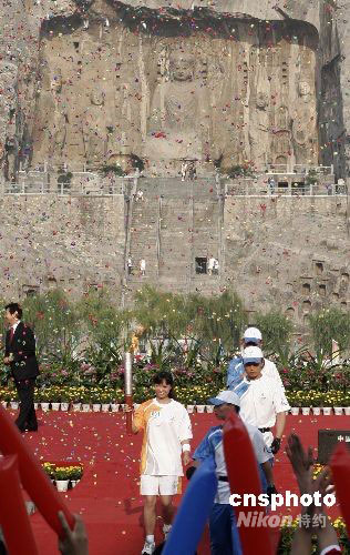 9月4日,火炬手在最具洛陽特色的城市名片--世界文化遺產(chǎn)龍門石窟景區(qū)內(nèi)傳遞殘奧會火炬。當(dāng)日,北京2008殘奧會火炬在千年帝都、牡丹花城洛陽傳遞,有65名火炬手參加傳遞。北京2008殘奧會火炬?zhèn)鬟f共有兩條線路,一是“時代風(fēng)采線”,二是“中華文明線”,洛陽是“中華文明線”5個殘奧會火炬?zhèn)鬟f城市之一,也是進(jìn)入北京前的最后一個傳遞城市。9月5日兩路火炬將在北京匯合,9月6日晚在殘奧會開幕式主會場點燃主火炬。中新社發(fā) 張曉理 攝