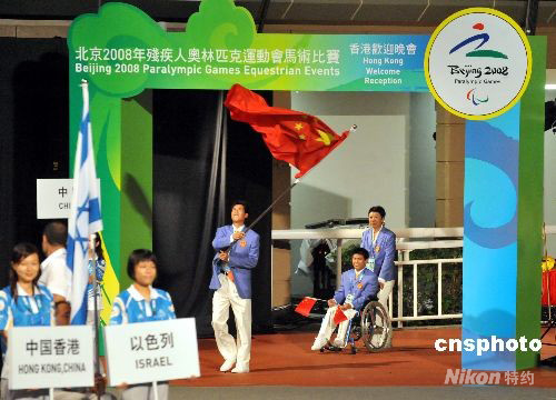 九月六日,北京二零零八年殘奧會(huì)馬術(shù)比賽開幕式在香港舉行歡迎晚會(huì),中國(guó)殘奧馬術(shù)選手彭裕連在運(yùn)動(dòng)員入場(chǎng)式上進(jìn)場(chǎng)。中新社發(fā) 鄧慶樂 攝