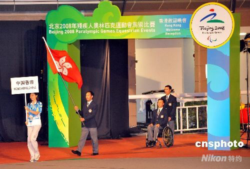 九月六日,北京二零零八年殘奧會(huì)馬術(shù)比賽開幕式在香港舉行歡迎晚會(huì),香港殘奧馬術(shù)選手葉少康在運(yùn)動(dòng)員入場(chǎng)式上進(jìn)場(chǎng)。中新社發(fā) 鄧慶樂(lè) 攝